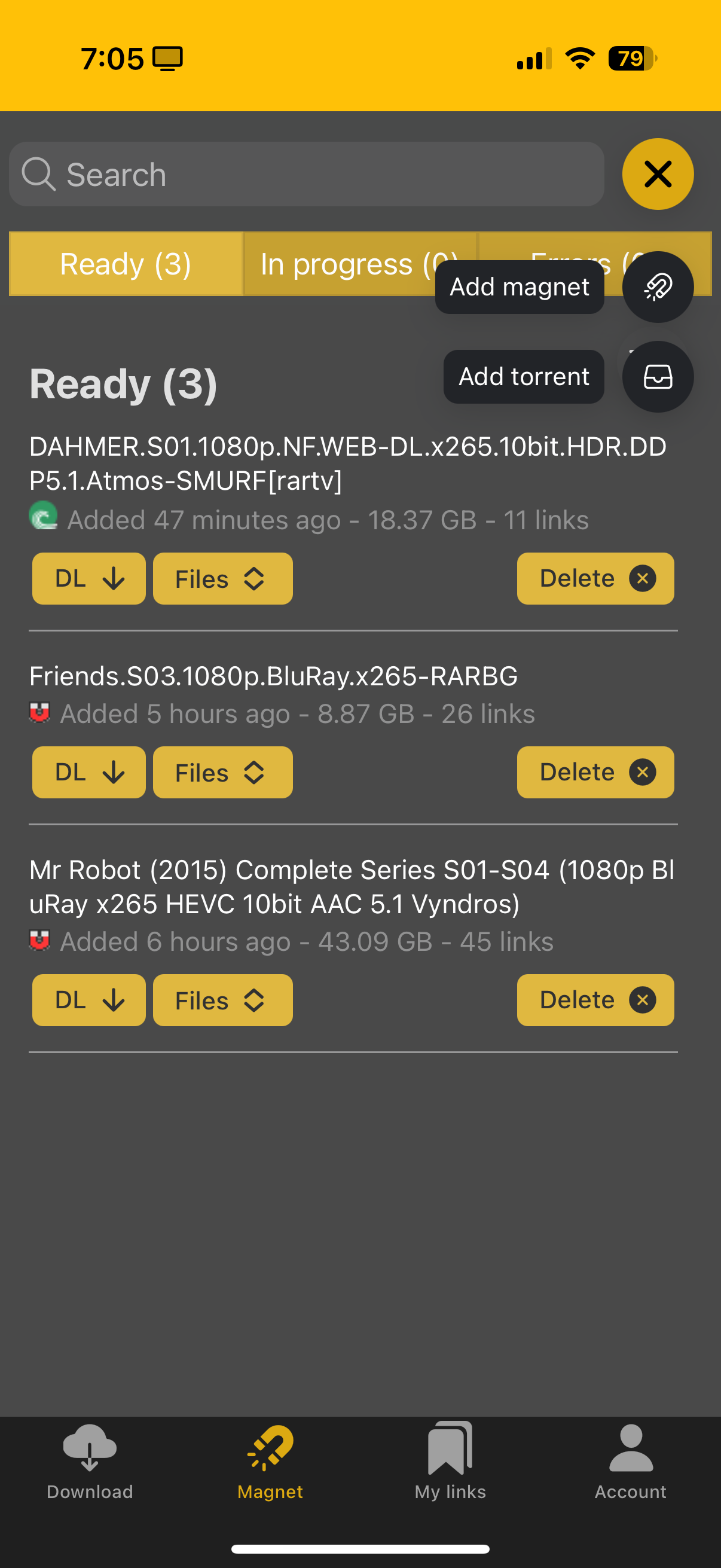 Mobile view to be used on iPhone with “add to Home Screen” similar to alldebrid. Screenshot shows the magnet tab with “add magnet” and “add torrent” options.
